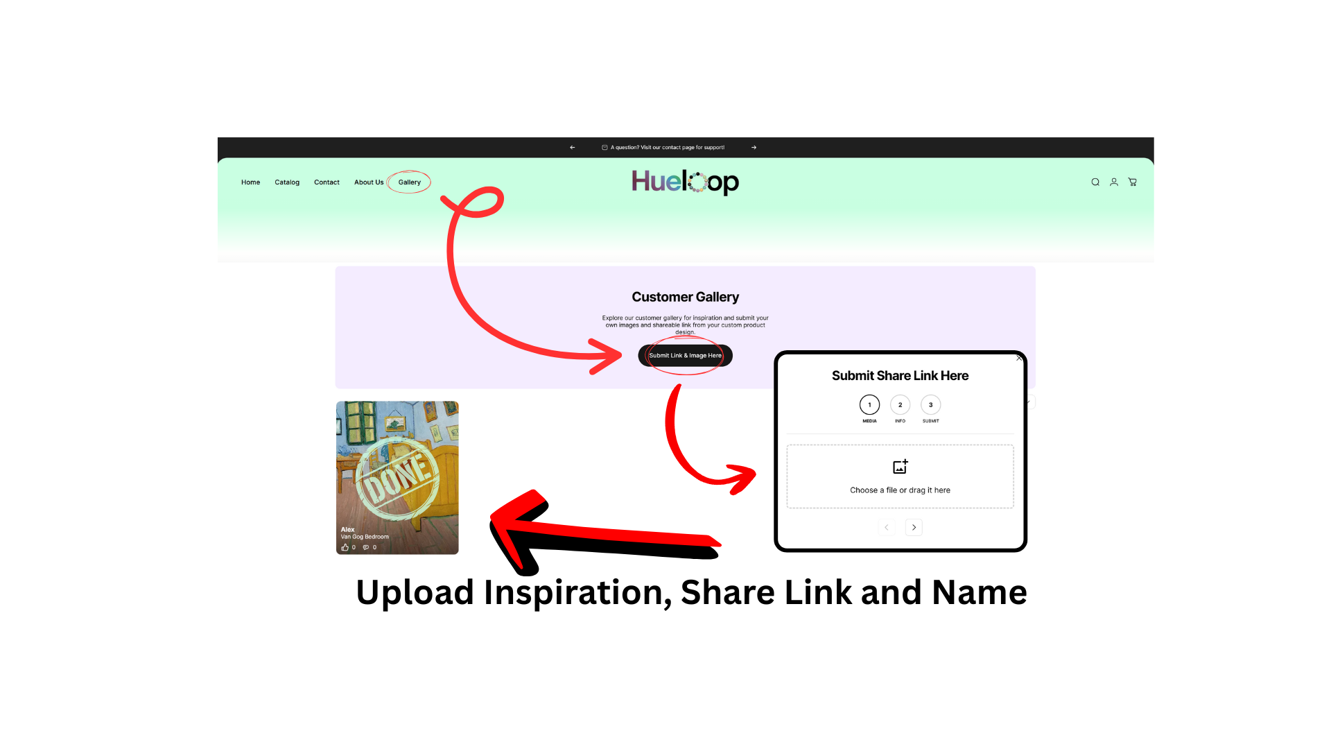 Explore our customer gallery for inspiration and submit your own images and shareable link from your custom product design.